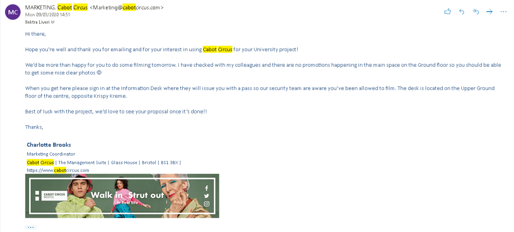 In order to film our prototype video in Cabot Circus, we emailed their marketing team to ensure that we had permission to film within the space as it is considered as private property. The marketing team granted us access and so we were able to proceed with our filming.