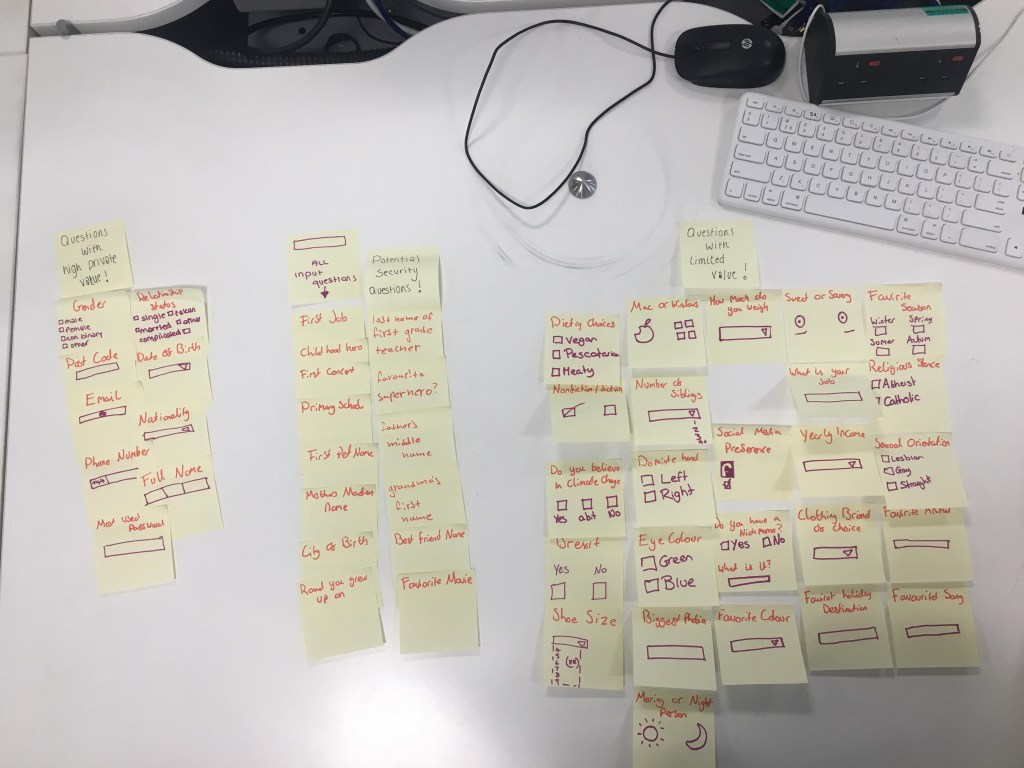 This week we started development on our user research for our project “Pieces Of Me” and used the card sorting method to categorise the questions we will be asking the participants of the experience. We grouped them as a collective group and approved of the grouping of each question, but any individual changes could also be discussed.